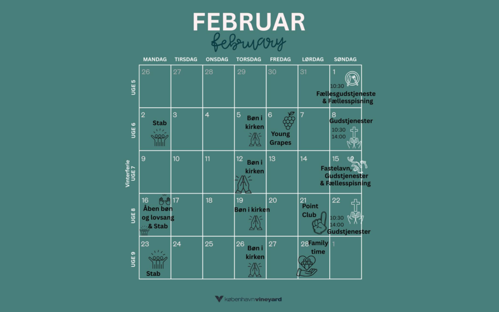 Bøn for kirken – torsdag d. 19. februar Kom og vær med torsdag, hvor vi beder for vores kirke, fællesskab og by.… Read more: Bøn for kirken – torsdag d. 19 februar - Point Club (Young Grapes) – lørdag d. 21. februar